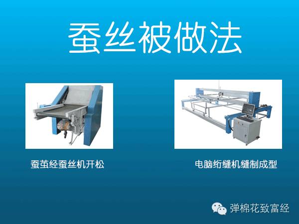 蚕丝被的做法是将处理后的蚕茧经蚕丝机开松梳理以后,再用电脑绗缝机缝制,现在市面上大家看的大多只是绗缝这一道工序。很多打着19元一斤的蚕丝,你真信吗?